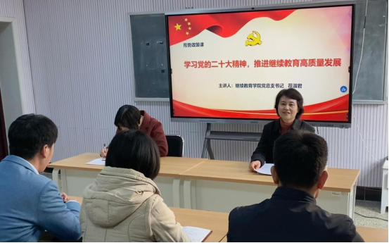 为深入学习宣传党的二十大精神,加强学院师生党性修养,11月18日下午,学院党总支书记茌淑君以“学习党的二十大精神,推进继续教育高质量发展”为题,为av淘宝