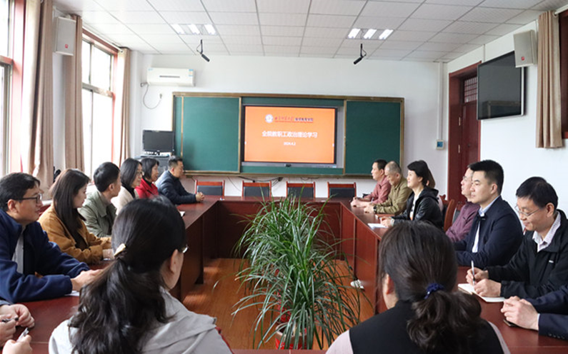 42日,学院召开教职工全体会议开展政治理论学习,学院领导班子及全体教职工参加,党总支书记茌淑君主持会议。