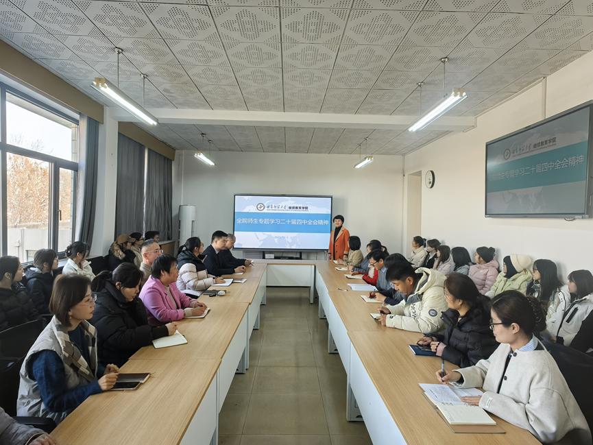 为深入学习贯彻党的二十届四中全会精神,准确把握其核心要义与实践要求,引导广大师生切实把思想和行动统一到中央决策部署上来,根据学校党委统一安排,12月5日上午,学院召开专题学习会议,集中学习领会全会精神。会议由学院党总支书记茌淑君主持并领学。