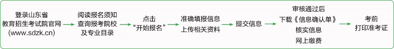 报名工作由网上报名、信息审核和网上缴费三个环节组成,网上报名时间预计为2022年8月,考生登录山东省教育招生考试院网站( www.sdzk.cn)填写个人基本信息(持有二代身份证的考生不得选择其他证件报考)、填报两个顺序志愿并上传考生个人资料,待审核通过后再登录山东省教育招生考试院网站进行网上缴费完成报名。考生可于考前登录山东省教育招生考试院网站打印准考证。