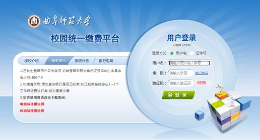 1.打开网页//cwcwx.av-taobao.net/xysf/,也可点击av淘宝 网址的主页下方的缴费平台选择用户名登录,用户名即学号,初始密码为Qfnu#加身份证号后六位(身份证号末尾字母大写);也可选择证件号登录,输入身份证号码、姓名、验证码,第一次登录后请及时修改密码。