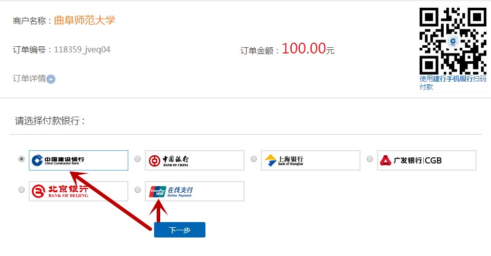 (3)选择支付方式。推荐使用“建行”或“在线支付---直接付款”