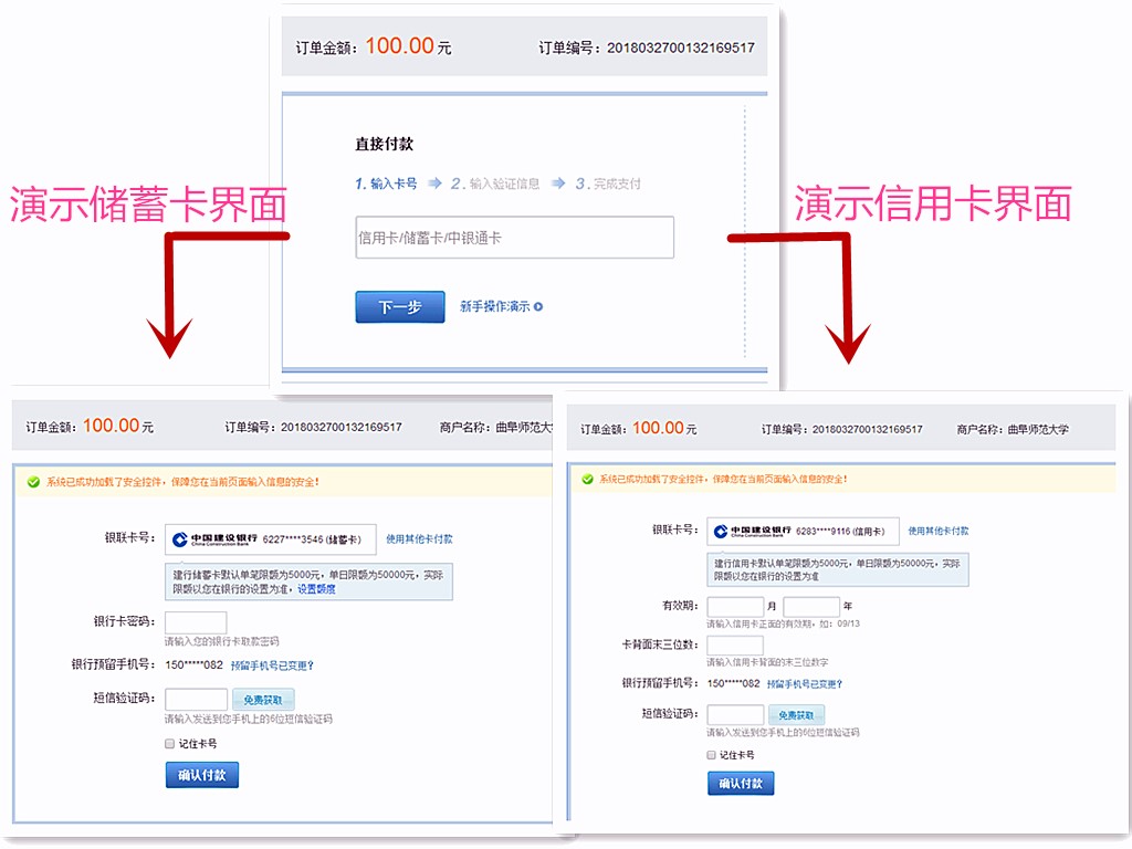 (4)“在线支付--直接付款”,支持储蓄卡、信用卡。按要求填写相应信息,确认付款。各个银行的支付界面可能稍有不同。