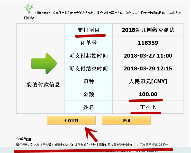 (2)进入订单页面,请核对支付项目、缴费金额、姓名是否正确,确认无误后,点击“全额支付”。