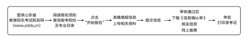 报名工作由网上报名、信息审核和网上缴费等环节组成,网上报名时间预计为20248月,考生登录山东省教育招生考试院网站(www.sdzk.cn)填写个人基本信息(持有二代身份证的考生不得选择其他证件报考) ,网上报名系统有短信验证功能,填报的个人联系信息须为本人实际通信地址和联系方式,同一手机号码只能验证一人,切勿填写招生人员提供的信息。考生须填报两个志愿并上传个人资料,待审核通过后再登录山东省教育招生考试院网站进行网上缴费完成报名。考前考生须登录山东省教育招生考试院网站打印准考证。